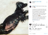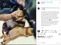キャプションの続きには、「ルナは1週間前の午前5時に3匹のパピーを出産しましたが、あと4匹のパピーを帝王切開してもらうために、獣医のところに駆けつけなければなりませんでした。悲しいことに、そのうちの1匹は助かりませんでしたが、6匹のパピーは元気で、幸せそうにお乳を飲んでいます。6匹ともすでに、彼らを待っている素晴らしい家族(引き取り手)が決まっています」