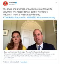 この火災を収めるべく、多くの消防隊員(ファースト・レスポンダー)が命を顧みず消火活動にあたっていたことは世界中で知られるところとなったが、彼らに敬意を表した「Thank a First Responder Day」が制定されたことで、ウィリアム王子とキャサリン妃も彼らに敬意と謝意を表し、ビデオメッセージを送った様子が、NSW州地方部災害対策室の公式Twitterなどに掲載された。