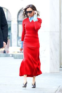 また、ニューヨークの街を歩く姿を撮影されたヴィクトリアは、青いシャツに深紅のニットのスーツで、こちらも色鮮やかな人目を引くスタイリッシュな装い。今年はキャサリン妃も年頭から鮮やかなカラーの服を着て注目を集めているが、ヴィクトリアもそのトレンドにしっかり乗っているようだ。