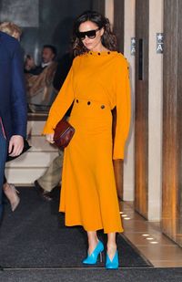 騒動の最中に仕事で英国を去り、ニューヨークへ飛んだ時のヴィクトリアのファッションは、全身黄色のツーピースに鮮やかなブルーの靴。手にはキャサリン妃風のクラッチバッグを持って大ぶりのサングラスをかけていた。