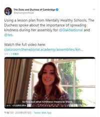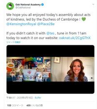 キャサリン妃が、前日にオーク・ナショナル・アカデミー(ONA)の公式Twitterで予告されていた通り、18日の朝10時から、ONAの朝礼にリモート出演。約10分間にわたって、オンラインで「いたわり」の大切さを訴えた。