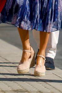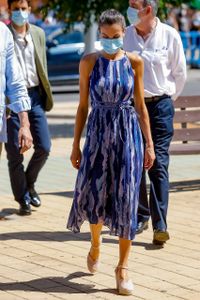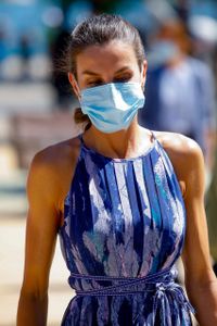 今回は、23日にグラン・カナリア島とテネリフェ島を訪れた際と同じポニーテールヘアに、スペイン発マカレナの生成りのウェッジソールサンダルは履き回しだが、スペイン発の御用達ブランド、アドルフォドミンゲスのワンピースを新調。ホルターネックで、鮮やかな青地のプリーツに、水色、ピンク、白の模様があしらわれたこちらのワンピは、250ポンド(約3万3500円)から100ポンド(約1万3400円)と大幅値下げしていた商品でもあったため、“レティシア王妃効果”で瞬く間にネットで完売した。