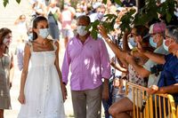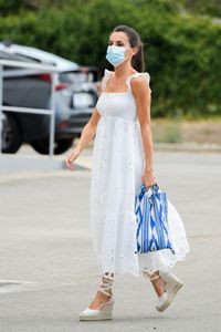 ポニーテールのレティシア王妃は、先日のスペイン発ヴィンテージ・イビザのワンピースに続いて、スペイン発ウテルケの白いレースのワンピースをチョイス。スペイン発マカレナのウェッジソールサンダルは履き回し、バッグは、先日赤いワンピースとコーデした、スペイン発Bolsas FQの布バッグと色違いの青白バッグで、こちらも以前から使用していたもの。今回も、水色のマスクも含めて白とブルー系で統一したシンプルコーデが完璧のはずだった。
