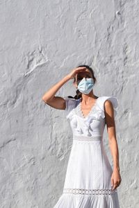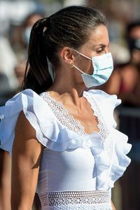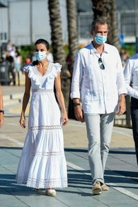 この日もレティシア王妃はポニーテールにブルーのサージカルマスク姿。麦わらバッグは、先日娘たちのレオノール王女とソフィア王女も含め、家族でパルマ・デ・マヨルカを訪問した際に着ていた、スペイン発ヴィンテージ・イビサの白いレースのワンピースに合わせたWhittelilyのもの。ベージュのウェッジソールサンダルも、先日のウテルケの白ワンピに合わせて着用していたものだった。
