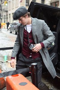 しかし今回、センター分けの長いウェイビーヘアに、プラム色の膝丈コート、黒いタイツにアンクルブーツを履いているハーパーは、終始ご機嫌な様子。うつむいていても、まるで笑いが止まらないという感じで満面の笑みを浮かべており、時おり歯を見せてカメラの方を見ているショットも捉えられている。
