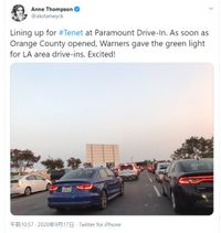 ドライブイン・シアターは日暮れ後のみの営業、さらにロサンゼルス中心部から最も近いパラマウント市にあるドライブイン・シアターは、現地でしかチケットを購入できない。というわけで、夕方からは夜19:50からの上映に合わせ車が殺到する、“『TENET テネット』渋滞”が起きているそうだ。ロサンゼルス在住の映画ジャーナリスト、アン・トンプソンも渋滞に巻き込まれた一人。