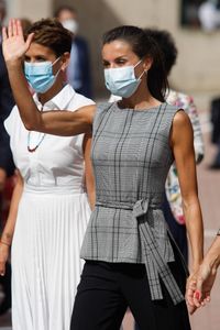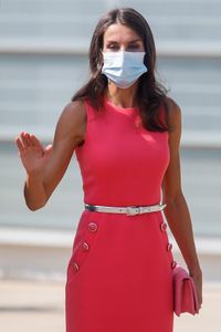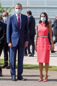 スペインの日刊紙「エラルド・デ・アラゴン」の創刊125周年を祝う式典にフェリペ6世国王と共に出席したレティシア王妃が選んだのは、2年前にアメリカのトランプ大統領とメラニア夫人を訪問した際に着ていたマイケル・コースの華やかなピンクのノースリーブワンピースに、シルバーのベルトでアクセントをつけた装い。クラッチバッグもパンプスもピンクで同じ組み合わせだが、唯一違うのはブルーのマスクを着用していることだ。
