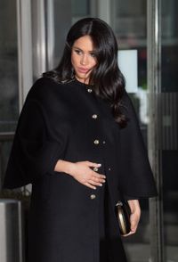 メーガン妃お得意の着こなしである肩掛けコート着用で、第2子妊娠説が浮上している。