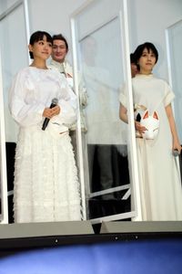 高田郁の時代小説を映画化した本作は、料理人として働く主人公、澪の苦悩や試練、生き別れた幼なじみとの友情などを描いた感動作。数多くの作品を手掛けてきた角川春樹が、“生涯最後の監督作”としてメガホンをとった。「映画は祭りだ!」をテーマに、登壇者全員が、福をもたらすと言われる白狐の面を手に、白が基調の衣装で登場した。