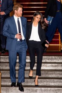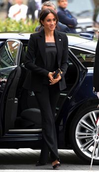 スーツ姿でカメラ目線のヘンリー王子とは対照的に、カメラ目線を避けたメーガン妃は元女優とあって大きく口を開けて不敵な笑みを浮かべている左斜めからのショット。ウェービーヘアに白いインナー、そして黒いウールのパンツスーツはなんと英国発アレキサンダー・マックイーンのもの。2018年2月の着回しのようだが、英王室離脱後初、しかも先日、キャサリン妃と、デンマークのメアリー皇太子妃、そしてトップスだけだがケリー・オズボーンが着ていたブランドをあえて選んだのは驚きで、「キャサリン妃に敬意?」「いやいや、『喪以外での黒、しかもアレキサンダー・マックイーンのパンツスーツを王室で最初に着たのはワタシ』と言わんばかり」といった声が寄せられている。
