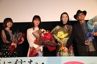 この日は、会場に来られなかった男性キャストから女性陣に“リモート花束贈呈”が行われることになり、岩田から多部、大森南朋から岸井へ、鶴見辰吾から美村へとプレゼントが贈られた。スクリーンに映しだされたメッセージを楽しそうに見ていた女性陣。岸井は「うれしい」、美村も「皆さん優しい。心遣い、ありがとうございます」と大きな笑顔を見せる。最後に青山監督は「楽しい現場になった。うれしい限り」と充実感を語り、多部は「また明日も、一週間後も、一年後も、皆さんの印象に残っている映画になっていたらいいなと思います」と心を込めて語った。