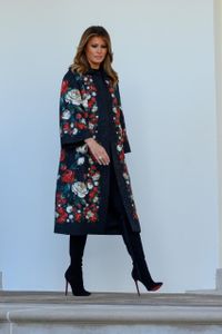 メラニア夫人、ハンサムスーツから一変し肩見せワンピでフェミニンに