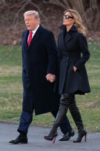 メラニア夫人の装いは、ラウンドネックのセーターにダブルのアズディン・アライアの6610ドル(約68万4000円)のコートに、クリスチャン・ルブタンの2195ドル(約22万7000円)のニーハイブーツ、バレンシアガのものと思われるサングラスとオールブラック。トランプ大統領と仲良く手をつないでプライベートジェットに乗り込む様子は、これまでにないほどの笑顔で、手をつないでいない方の左手を、わざわざポケットから出して薬指の大きな指輪をアピールした。