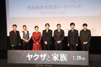 『新聞記者』(19)の藤井道人監督の最新作『ヤクザと家族 The Family』(1月29日公開)の完成報告&生配信トークイベントが1月11日に神楽座で開催され、綾野剛、尾野真千子、北村有起哉、市原隼人、磯村勇斗、舘ひろし、藤井監督が登壇。