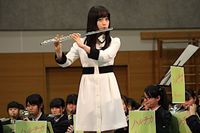 演奏曲は、映画のオリジナルテーマ曲「吹奏楽のための狂詩曲第1番『春の光、夏の風』」。ホルンの佐藤、フルートの橋本も真剣な眼差しで取り組み、吹奏楽部のメンバーと一緒に美しく迫力のあるハーモニーを響かせた。