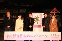 岩田は「キャスト、スタッフみんなで話し合って、文字を決めた。この作品の一つの大きなテーマが、人と人のつながり、絆。この作品を一言で表すなら、この文字しかないだろうと思った」と「絆」を書いた理由を語る。筆を進める岩田の印象を聞かれた新田は「ものすごいかっこよかった!」と笑顔を見せ、文字についても「すっごい上手。習われているのかと思った。びっくり。すばらしい」と大絶賛。岩田が「ありがとうございます。照れくさいな」と照れ笑いを浮かべるなか、佐藤監督も「岩ちゃんは、もっと繊細で細い字を書くのかと思った。男らしく、太く、勢いのある書を書いていただいたので、僕もびっくりしました」と惚れ惚れとしていた。