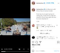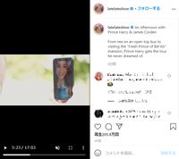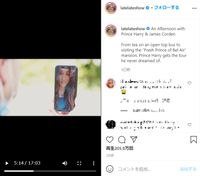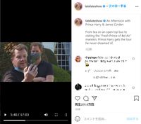 メーガン妃が現れたのは、26日にオンエアされた米CBSのトークバラエティ番組「レイト×2ショー with ジェームズ・コーデン」。ヘンリー王子と、番組のホストで旧友であるジェームズ・コーデンが、オープントップバスに乗ってロサンゼルス市内を観光しながら1対1で語り合うなどしているが、1990年代の人気テレビシリーズ「The Fresh Prince Of Bel-Air」で使用された邸宅の庭で話している際に、メーガン妃がスマホのFaceTimeで登場。