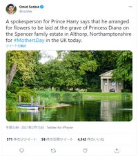 ヘンリー王子の広報が「The Independent」などに明らかにしたもので、「ヘンリー王子は、母の日に故ダイアナ妃の墓前に花を捧げる手配をした」そうで、ヘンリー王子夫妻の伝記本「自由を求めて:ハリーとメーガン 新しいロイヤルファミリーを作る」の著者オミッド・スコビーが、それについてTwitterで情報を拡散している。