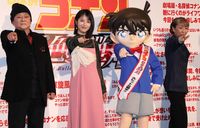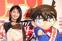大のコナンファンで、念願のゲスト出演を果たした浜辺は、“弾丸”をイメージさせる“銃モチーフ”のヒールを履いて登場。「1年に1回、春が来るのが楽しみだった。皆さんの気持ちがとてもわかる。1年待った皆さんの熱量が深く染みてくる」とファンの気持ちに寄り添い、「すばらしい作品に携わることができて幸せ」と感激しきり。司会から「もしまた次回、出演するとしたら?」と聞かれると、浜辺は「関われたことを思うと、改めて申し訳ないし、緊張してしまう」と恐縮し、「もしできるなら、ダンゴムシとか…」と照れ笑い。高山から「同級生とかどうですか?」と勧められるも、浜辺は「人の言葉をしゃべらせていただけるなら、インコの声がギリギリです!」と遠慮がちに語っていた。