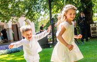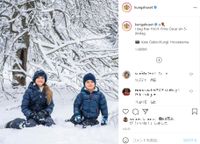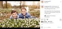 一家が暮らすハーガ宮殿の庭で撮影されたもので、1枚目は、一面に白い小花が咲き乱れた庭に座っている4人とリオの写真。2枚目は、お揃いのGジャンでコーデしたエステル王女とオスカル王子が、腹ばいに寝そべって満面の笑みを浮かべているツーショット写真だ。