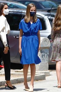 レティシア王妃はMaksuの白いブラウスに、黒いパンツとバックバンドヒールという装い。妹のソフィア王女は花柄のMangoのワンピース、レオノール王女はロイヤルブルーのVネックのワンピースに、ベージュのバックバンドヒールと紺の布マスクで参加した。