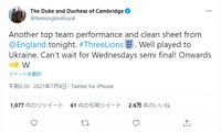 イングランドサッカー協会の会長を務めるウィリアム王子は早速公式Twitterに、「今夜もイングランド代表スリーライオンズは、またトップチームならではのパフォーマンスと無失点。ウクライナ代表相手に素晴らしいプレーでした。水曜日の準決勝戦が待ちきれません(こぶしの絵文字マーク)。先へ! W(ウィリアム)」という喜び冷めやらぬコメントを投稿。多くのユーザーにリツイートされているが、なかでも今回特異だったのは、ジョージ王子についてのコメントだろう。