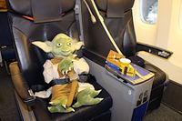 「C-3POにオマージュを抱いたデザイン。ひとつひとつのパーツを見事に表現してくれた」と興奮しきりのアンソニーだが、サービスたっぷりに撮影エピソードを披露する一幕も。「エピソード1、2、3では後ろから操り人形のようにドロイドを操っていた。しかし石につまづいて転んだ時に、その銀河系にひとつしかないドロイドを壊してしまった」。そして飛行機の底面にはC-3POが背中に装備しているバッテリーパックが描かれていたが、このバッテリーパックについても秘話が。