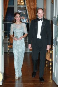 その夜の晩さん会では、御用達のジェニー・パッカムのアイス・ブルーのイブニングドレスで登場。ラウンドネックに五分袖のシースルーに、ラメやビーズがちりばめられたフロアーレングスのドレスに、エリザベス女王から借りたというシャンデリア型のイヤリング、そしてオスカー・デ・ラレンタのシルバースパークリングのヒールといういでたちで注目を集めた。