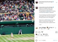 気温約18度の曇り空の下、ウィリアム王子と最前席に座ったキャサリン妃は、鉄板の小花柄マスクに、エメラルドグリーンのエミリア・ウィックステッドのAラインワンピース、白いジミー・チュウのパンプスという夏めいた装い。観戦中はマスクをしていなかったが、優勝したバーティにトロフィーを授与する様子などが「Daily Mail」などに掲載されている。
