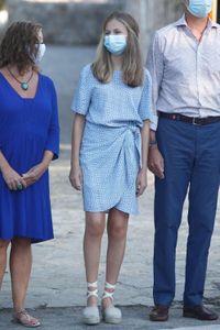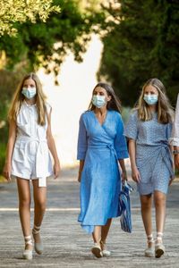バケーション中に、4日間にわたってメディアの前に姿を現した一家だが、スペイン王室の公式Twitterなどを見てみると、まず1日目、レオノール王女は、& Other Storiesの小花のブルーのワンピースに、レティシア王妃御用達のマカレナのウェッジソールサンダル。そしてソフィア王女は、長い脚が際だつザラの白いキュロットワンピースに、同じくマカレナのウェッジソールサンダルという装いで、姉妹はサンダル、リボンや白とブルーのカラーで母とともにクロスコーデ。