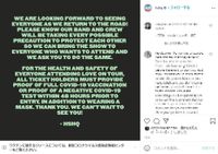こちらはHSHQ (Harry Styles Headquarters)の公式Instagramおよびイベントプロモーション会社「Live Nation」が明らかにしたもので、「『Love on Tour 2021』のチケット保有者には、皆さんの健康と安全のために、ワクチン接種証明書か、入場から48時間以内に受けたテストの陰性証明書の提示を求めます。またマスク着用も義務付けています。12歳以下の子どもは、48時間以内の陰性証明書の提示で入場可能です。すべてのスタッフに対してもマスク着用と共に、各公演ごとに観客と同じ条件が要求されます。これらは、スタッフや観客の健康と安全を保つための最善の方法であり、アメリカで開催されるコンサートでの新しい基準になってきています。どんな例外も認められません」と記している。