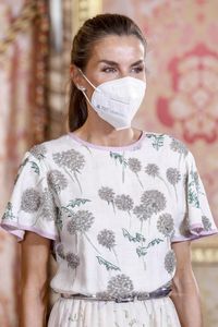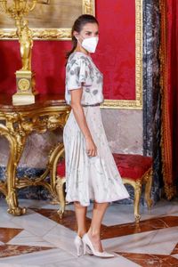 「Daily Mail」などによれば、ポニーテールにマスク姿のレティシア王妃が着ていたのは、ラウンドネックと袖、裾にピンクのドレープが入った、花柄のペールピンクのフレアワンピース。同色のパンプスに、シルバーのベルトに合わせたシャネルのシルバーの飾り羽のイヤリングというワンアクセが効果的なファッションだった。だが注目すべきは、なんとこのワンピースは、1981年、当時の国王でフェリペ6世の父フアン・カルロス1世とともにイタリア外遊を行った際に、レティシア王妃の義母ソフィア妃が着ていたものだということ。