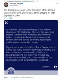 英王室は、2001年にはバッキンガム宮殿で、20年となる今年は、ウィンザー城で在英米国大使などを招き、黙祷とともに、米国の国歌に合わせての衛兵交代で追悼式が執り行われた。エリザベス女王は公式Instagramで、犠牲者及びその家族、そして消防士や警察官ら救助活動に尽力した人々に思いを寄せて追悼。また2010年に跡地を訪れたことにも触れ、世界中の人々が集まり、この場所を立て直すべく結束するコミュニティ力にも敬意を表している。