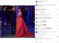 メーガン妃は、額を出したアップのお団子ヘアに、米国発キャロリーナ・ヘレラの、胸元が深く開き大胆なスリットが入った赤いストラップドレス、イタリア発ジュゼッペ・ザノッティの赤いスリングバックのパンプスという装い。