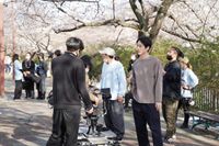 その後、茉莉が生きた人生を、移りゆく四季と共に描いていくために、約1年という長期スパンの撮影スケジュールが組まれたという。当日のロケ日は桜の開花状況に合わせて設定されたが、まさにドンピシャのタイミングだった。大型扇風機で風を起こすなか、小松たち2人が談笑しながら桜ロードを歩いていく。