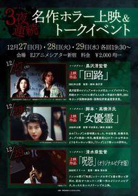 日本初のホラー映画専門コンペティションとして開催され、12月26日に第1回の授賞式を終えた「日本ホラー映画大賞」。その関連イベントとなる「3夜連続名作ホラー上映&トークイベント」の第2夜が28日にEJアニメシアター新宿にて行われ、中田秀夫監督の『女優霊』(96)が上映。上映前のトークイベントに同作で脚本を務めた高橋洋と、日本ホラー映画大賞で選考委員長を務めた清水崇が登壇した。