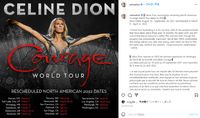 2021年10月、筋けいれんを理由に、2021年11月からリゾート・ワールド・ラスベガスで予定されていた公演を延期したセリーヌ・ディオンが、今度は3月9日から4月22日まで開催予定だったワールドツアー「Courage」の北米公演を中止することを、自身の公式Instagramで明らかにした。