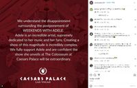 アデルは今月21日から4月16日までの毎週金曜日と土曜日、ラスベガスのシーザーズ・パレス内コロシアムでの定期公演を行う予定になっていた。また、7月にはロンドン公演も控えており、スケジュールの立て直しは容易ではないだろう。