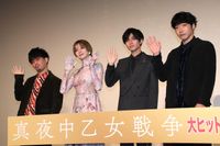 作家Fの同名小説をKing & Princeの永瀬廉主演で映画化した『真夜中乙女戦争』(公開中)の公開記念舞台挨拶が1月22日にTOHOシネマズ六本木ヒルズで開催され、永瀬をはじめ、池田エライザ、柄本佑、二宮健監督が登壇。「この景色、最高やなと思います」と有観客の会場を見渡し感無量の面持ちを見せた永瀬。「会場にはうちわをたくさん持ってきてくださった方がいる。ライブを彷彿させる雰囲気もある。ファンの方がいるから元気をもらっているなと思った」と感謝を伝えながら、「絶望が光になる、そういった行動ができる活力になれば」とコロナ禍の現状を踏まえ、本作に込めた想いを語った。