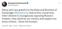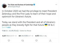 現地時間2月26日にウィリアム王子とキャサリン妃が、国民の先頭に立ってロシア侵攻に立ち向かう、ウクライナのゼレンスキー大統領とオレナ夫人に対して支持を表明。これを受けて、現地時間3月1日にゼレンスキー大統領は、「オレナと私は、ケンブリッジ公爵と公爵夫人に感謝しています。ウクライナがロシア侵攻に対して勇気をもって闘っている、この重要な時に、彼らは私たちの国を支持し、私たちの勇敢な市民をサポートしてくれています。善が勝利します」と自身の公式Twitterに投稿し、謝意を述べた。