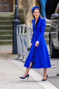 公務で身に着けるものには常になにかしらの意味を込めるキャサリン妃は、昨年からツートンカラーやモノトーンの装いが多くなっているが、今年はブルー系で統一。ロイヤルブルーのベルベットの襟元がアクセントのキャサリン・ウォーカーのコートに、ロック&コーのトーク帽、ルパート・サンダーソンのスウェードのパンプス、ジミー・チュウのクラッチバッグに手袋という装い。さらにサファイアとダイヤモンドのネックレスは、故ダイアナ妃が愛用していたものだが、そのネックレスとイヤリングは、2020年にウクライナのゼレンスキー大統領夫妻がバッキンガム宮殿を訪問した際に着けていたもの。