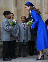 またキャサリン妃が、寺院の入り口で子どもたちから受け取った花束は、カミラ夫人が着ていたパープル、そしてキャサリン妃が着ていたブルーそして黄色と、ウクライナの国旗色でもあったことから、ワントーンの装いはエリザベス女王に、そして故ダイアナ妃とウクライナにオマージュを捧げた、クラシックでエレガントな装いだと「Entertainment Tonight」などが伝えている。
