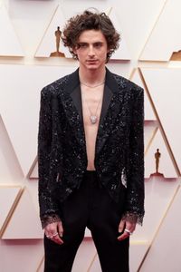 全身から輝きをあふれさせていたのが、『DUNE/デューン 砂の惑星』で主人公を演じたティモシー・シャラメ。ルイ・ヴィトンのキラキラとしたジャケットを素肌にはおったセクシーな装いで、見る者の目を奪った。袖口のレースや大振りのネックレスなど、随所にわたってセンスが光っていた。