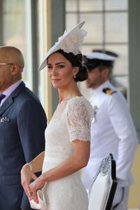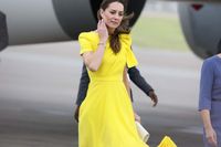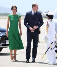 前回同様に、去り際にも国旗カラーを取り入れたファッションを着用したキャサリン妃。シニヨンにまとめたヘアスタイルに、エメラルドグリーンのエミリア・ウィックステッドのドレス、ジャンヴィト・ロッシのヌードカラーのパンプスに、キキ・マックドノウの淡黄色のシトリンのイヤリングという装い。前日に着けていたジャマイカ発のブレスレットは着用していなかったが、国旗カラーの2色を取り入れていた。