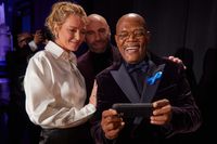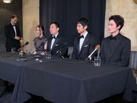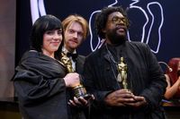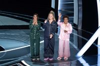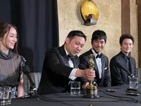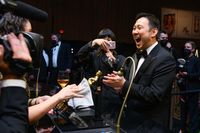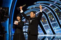 【写真を見る】『コーダ あいのうた』のトロイ・コッツァーと『ミナリ』のユン・ヨジョンが世界共通の手話、「アイラブユー」のサインで喜びを表す [c]Michael Baker / A.M.P.A.S.