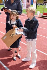 公式Facebookなどを見てみると、前回は、プラチナブロンドのベリーショートにシンプルなダークグレーのパンツスーツ、黒いパンプスにピアスというミニマルな装いでジャック公子とコーデしていたシャルレーヌ公妃。今回はアクリスの紺のベルトがアクセントのデニム素材のシャツドレスにピアス、黒いパンプスとサングラスというシンプルな装い。そして今回も、デニムジャケットに白いインナーとパンツのジャック公子、そして白いインナーにネイビー系のジャンパースカートとコートのガブリエラ公女とバッチリカラーコーデし、母と子の仲の良さを見せつけた。