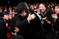 授賞式後に取材に応じた是枝監督は「自分の映画に出た役者が褒められるのが一番うれしいです。予想していませんでしたが、この作品にとって最高のゴール。とても美しいゴールだなと思います」と喜びを語り、授賞式の後にソン・ガンホと2人で抱き合って喜びを分かち合ったことを明かす。