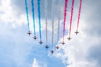 ジョージ王子とシャーロット王女と共に、70機の航空機によるフライパストをまぶしそうに見上げる様子が捉えられているが、なにやらエリザベス女王と会話をしている様子。「Daily Mail」で読唇術のジュリエット・サリバンが分析したところによれば、ルイ王子がエリザベス女王に、空を指さして「あれが見えた?」と話しかけると、エリザベス女王が身をかがめて「飛行機が描く3色の矢ですよ。あの煙を見てごらんなさい」とすこし飽き気味なルイ王子をサポート。物おじしないルイ王子とエリザベス女王の心が近しい関係が明らかになる心温まるシーンは、ルイ王子の七変化の表情とともに、多くの人々の心に刻まれたようだ。