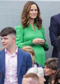 この日は、キャサリン妃の両親、そして夫のジェームズ・マシューズと一緒にピッパの姿も見られた。軽くウェーブのかかったヘアスタイルに、緑色のシルク素材で、しわ加工のME+EMのふんわりしたワンピースにもかかわらず、ピッパのお腹はかなり大きく膨らんでいたことから、妊娠は明らか。