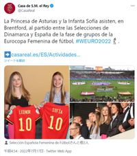 現地時間7月16日、ロンドンのブレントフォード・コミュニティ・スタジアムでデンマーク対スペインの試合が行われ、2人はスペインチームをサポート。「HOLA!」やスペイン王室のTwitterには、2人が選手らと歓談やハグをしたり、試合を観戦する様子などを捉えた写真が多数掲載されている。
